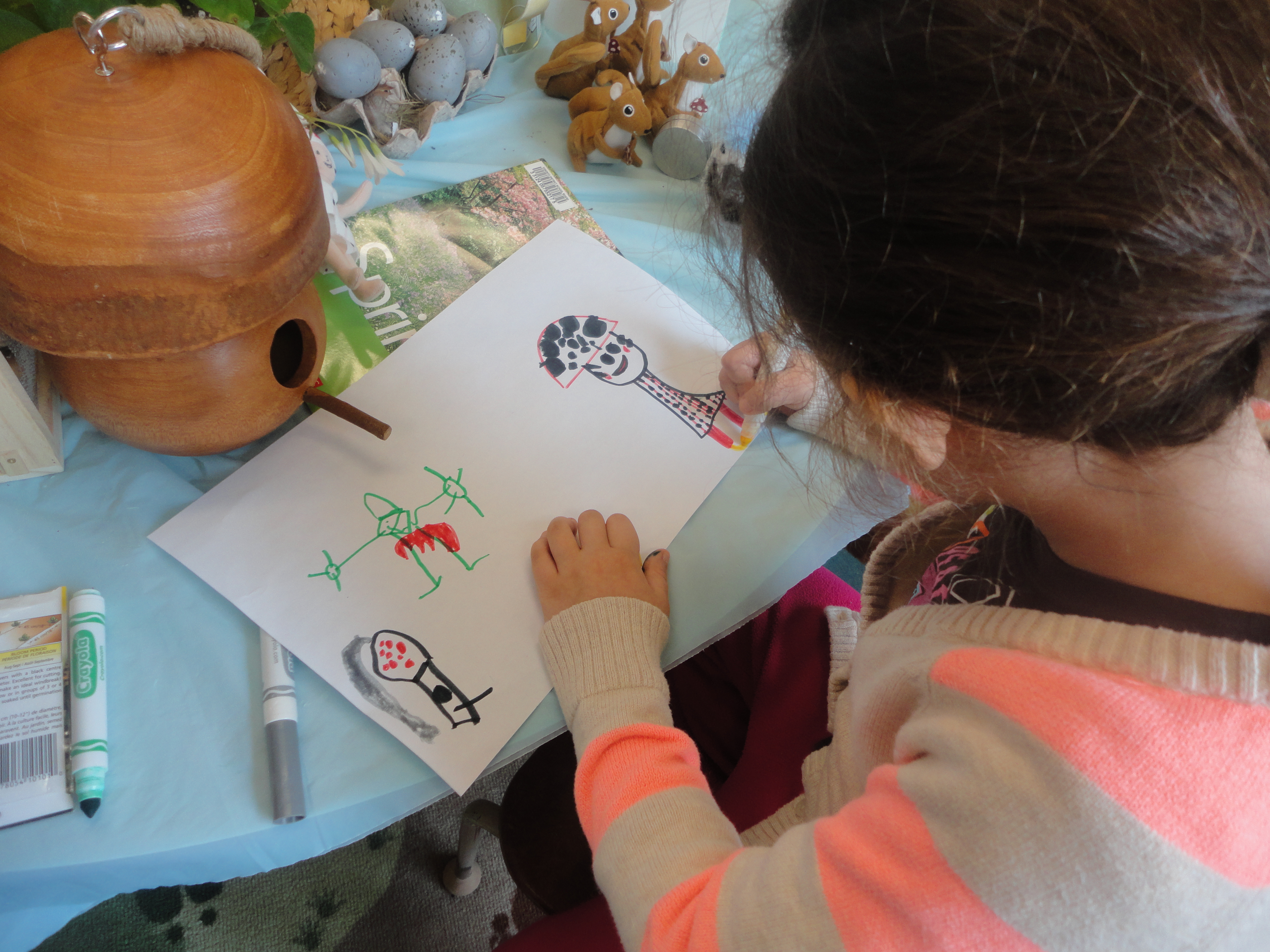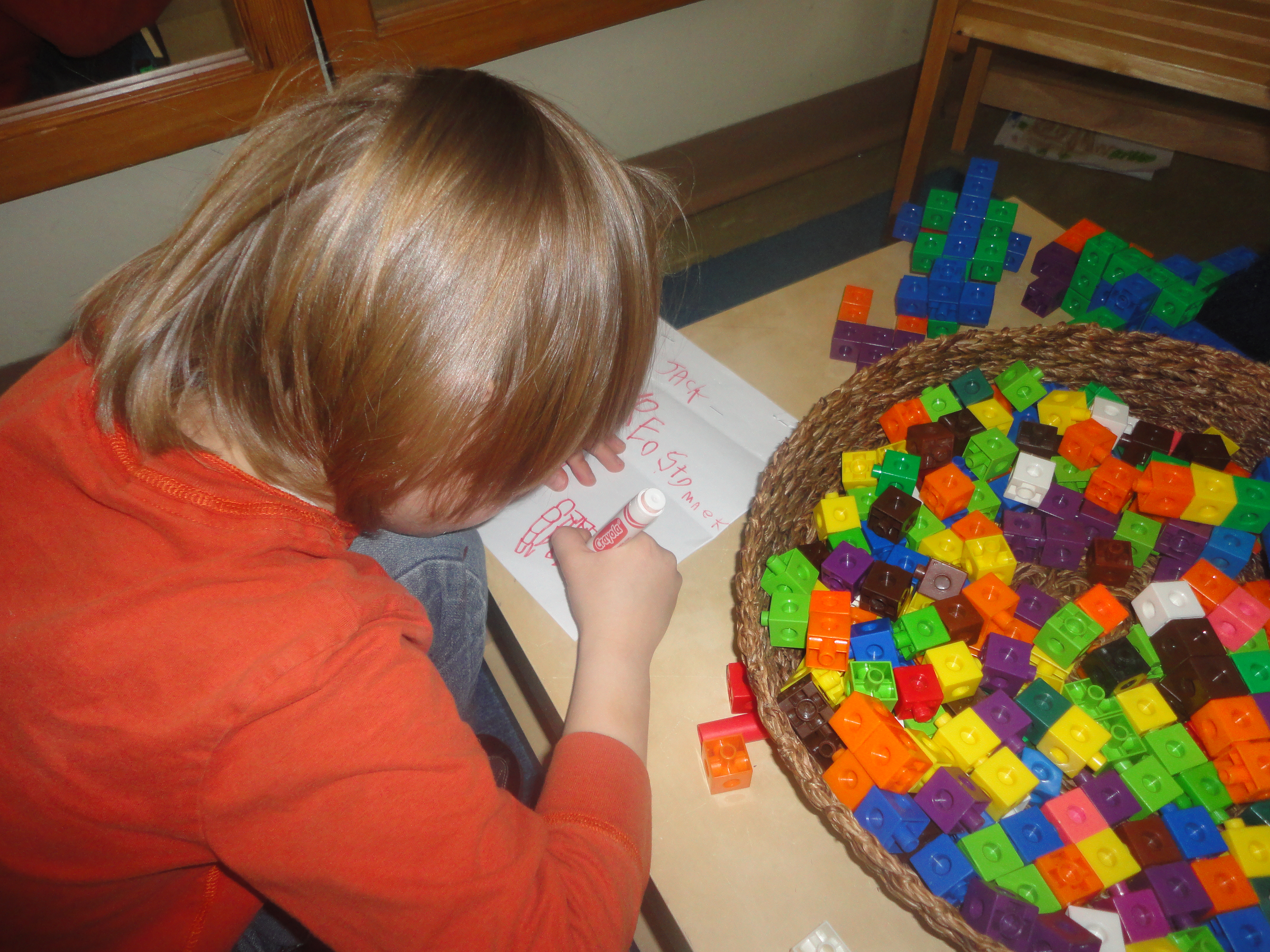 2) Each student gets their own bin of building materials (blocks, connectors, cups, etc.) and takes it to a table. The bin goes on the chair and the children stand at the table and build. I circulate and facilitate discussion, pose questions, take notes, take photographs.