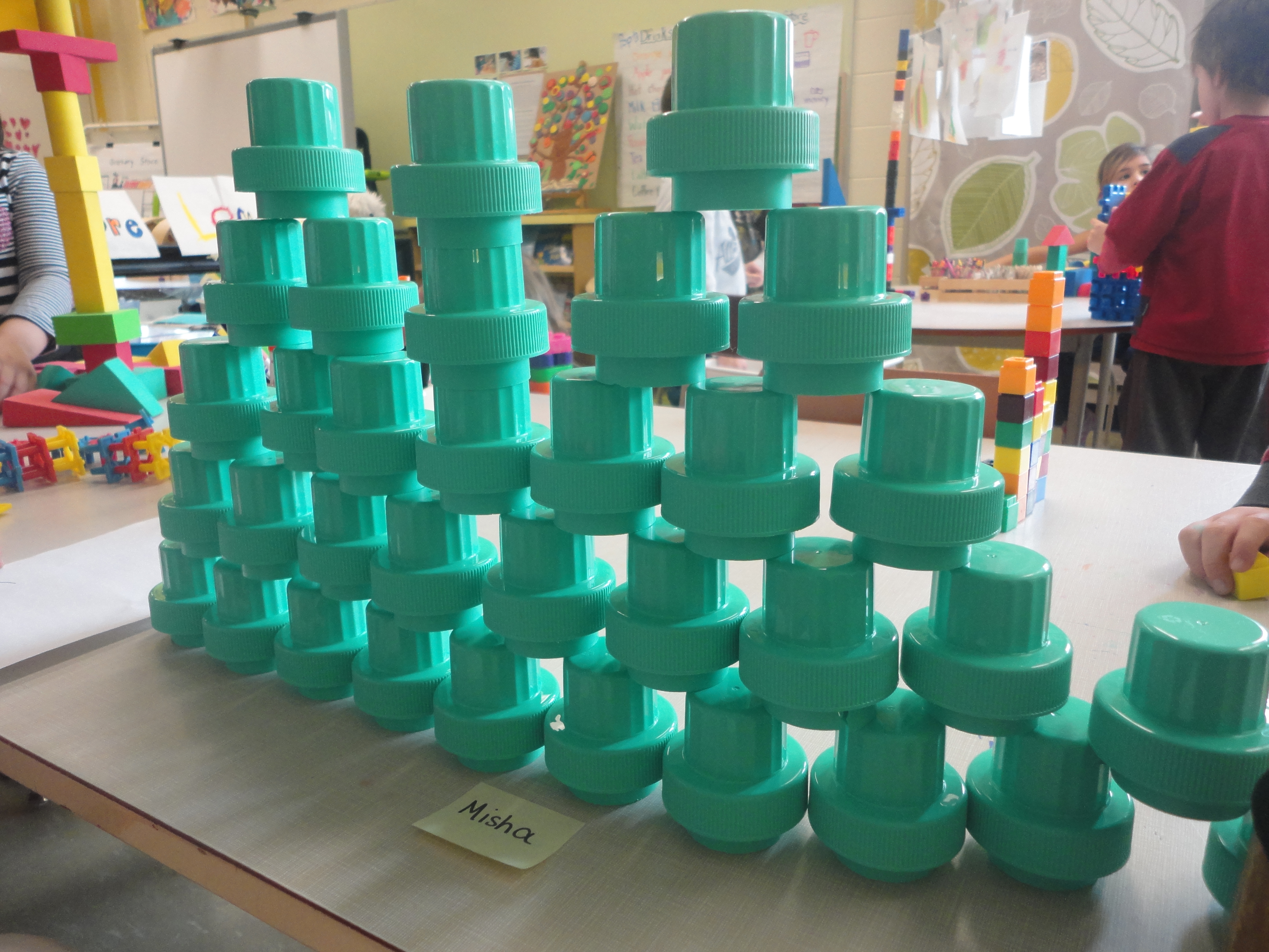 A: We use a variety of store-bought traditional building blocks and some found materials to make up our bins. Wooden blocks, tree blocks, better blocks (kind of like Duplo), foam blocks, cups (laundry caps) from the recycling depot, anything that will stack! I purchased some materials from school catalogues, found others at garage sales and recycling stores, and got some for free from the recycling depot in our school board. Anything that can stack reasonably well is a good material for M.S.I. If you don’t have enough for everyone in your class you could always run the program with children working in partners or groups, and we sometimes do this as well depending on the focus of the lesson.