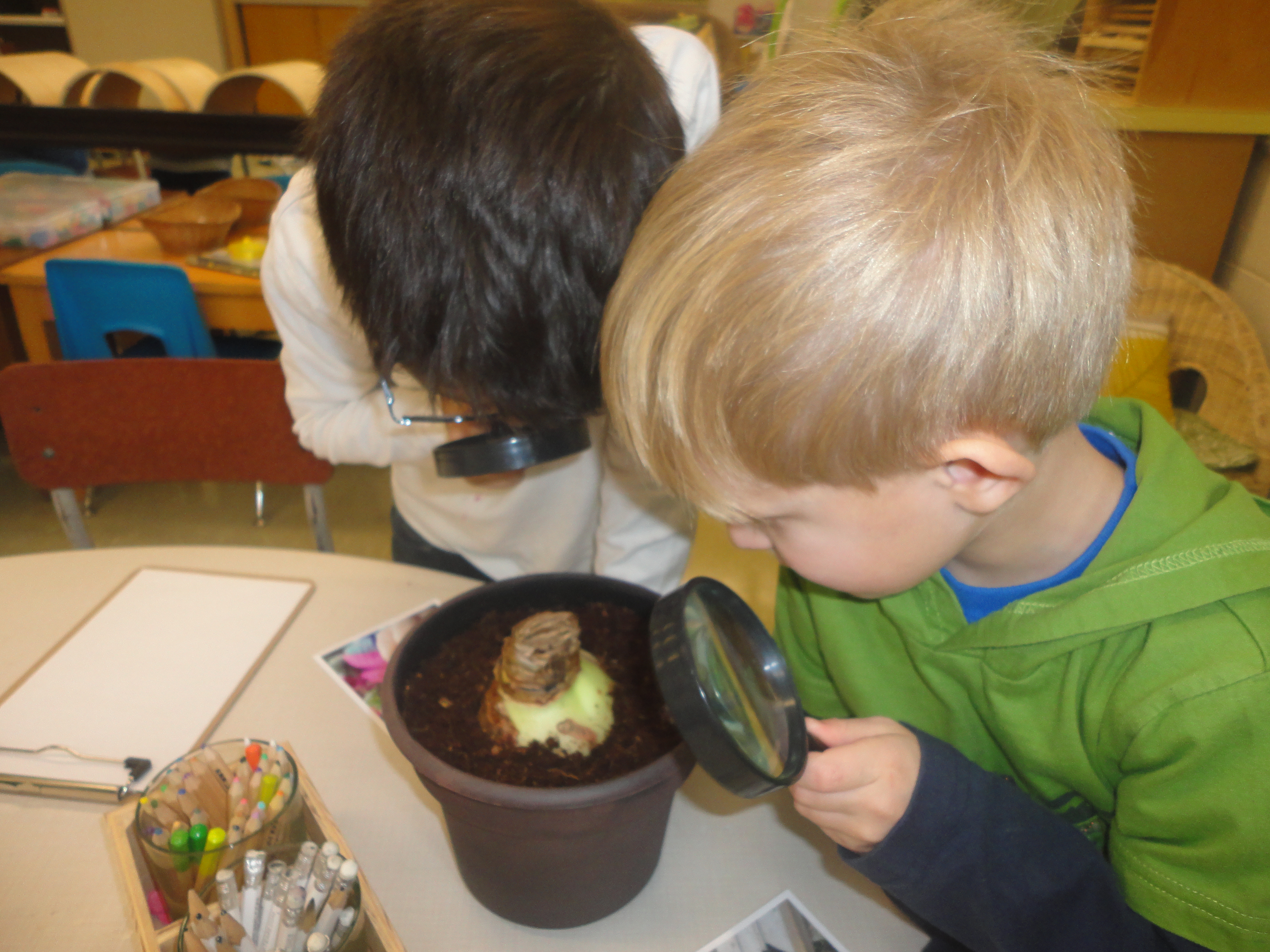 When we were arranging our schedule, we felt it was important to make sure that the children had ample time for working at discovery centres, both in the morning and in the afternoon. In the morning, our discovery time runs from 10:10 a.m. to 11:25 a.m. This time includes a self-directed snack (children stop to eat if/when they feel the need though most opt out of a morning snack) and reflection time. During centre time, the children self-direct their own activities. This was a big change for me initially. When I taught kindergarten half day, I was that teacher with the clipboard who assigned children to specific centres each day. In full day, I let go of making choices for the children and let them choose the activities that are most interesting and important to them. If I encounter a student who only ever chooses the block centre, I may suggest an alternative or invite him/her to see what is happening at the Art Studio. And I have never been turned down. Generally speaking, most children are interested in trying new things and are interested in the provocations that pop up around the classroom.