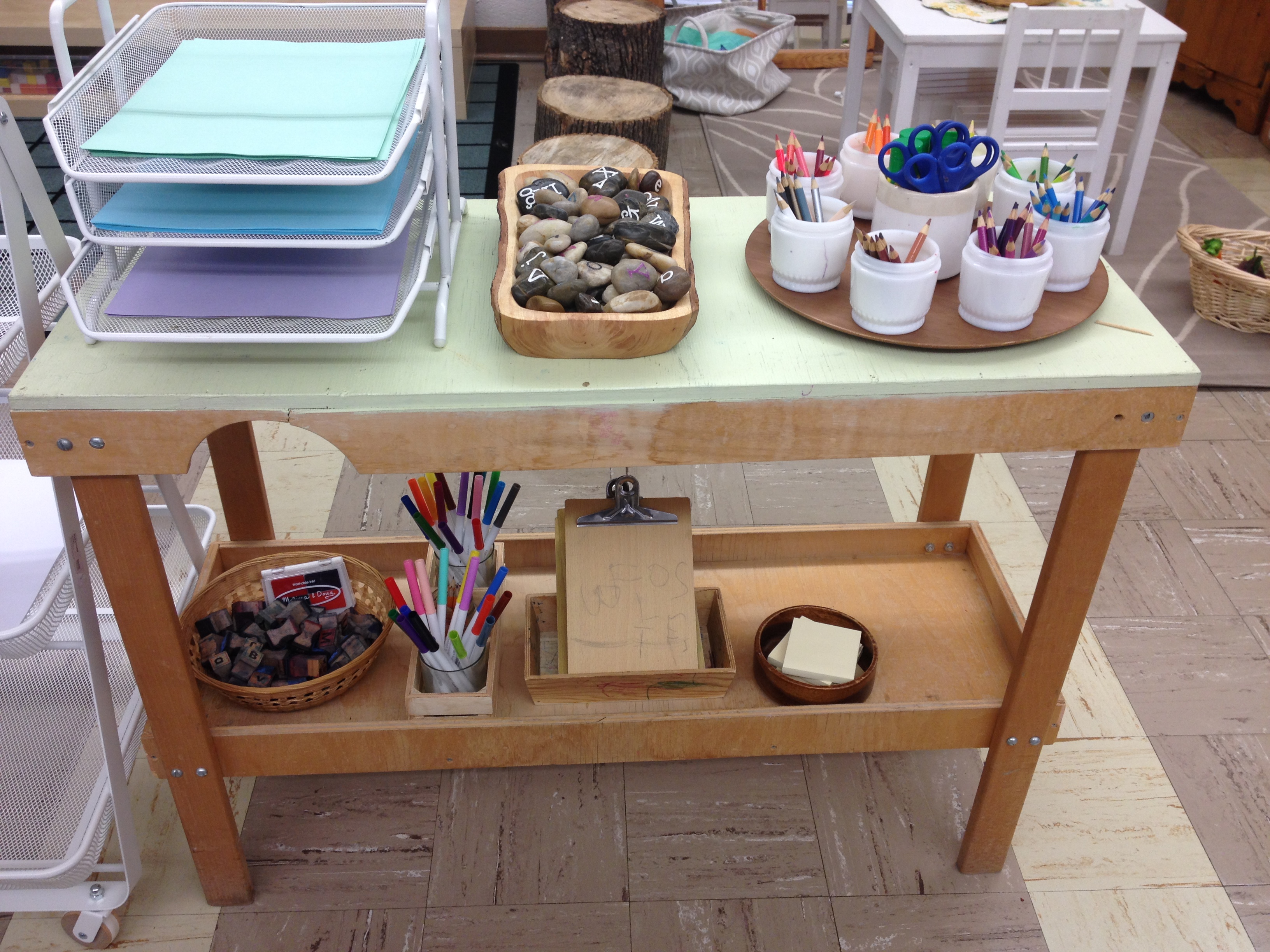 The Art Studio. Simple materials for making and creating are out right now. My students from last year were very interested in creating with recycled cardstock that a parent donates regularly. They love the stencils and making books with tape/washi tape. All of those materials are out for them to use as they wish and I’m confident the returning students will model for their new classmates how to use these materials creatively!